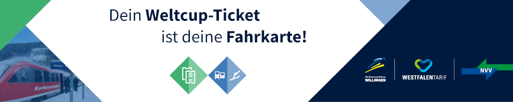 Mit Ihrer Eintrittskarte können Sie im gesamten NVV-Gebiet und WestfalenTarif-Gebiet kostenlos mit Bus und Bahn im Nahverkehr (2. Klasse) an- und abreisen. Das Ticket für die Hin- und Rückfahrt im Nahverkehr ist bereits im Eintrittspreis enthalten. Alle Züge halten am „Weltcupbahnhof“ Willingen-Stryck, nur wenige Minuten vom Veranstaltungsgelände entfernt.
