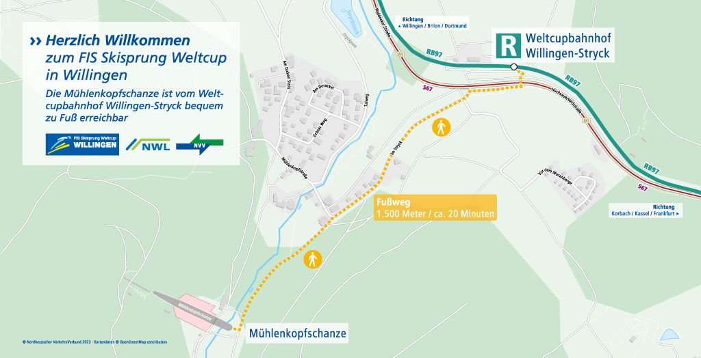 Vom Weltcupbahnhof Willingen-Stryck aus sind es nur wenige Gehminuten bis zur Mühlenkopfschanze. Der Weg ist gut ausgeschildert und führt direkt zum Veranstaltungsgelände.